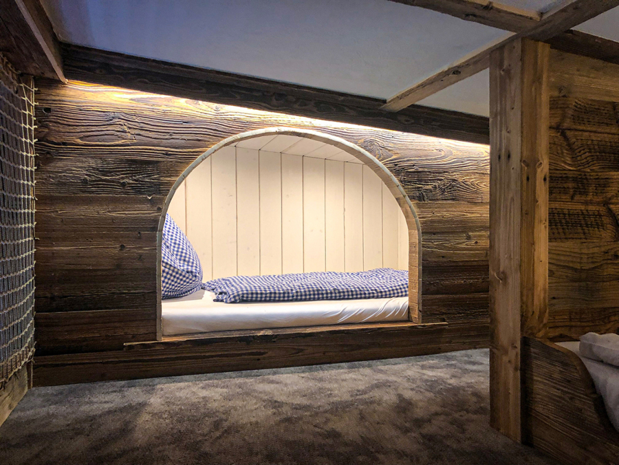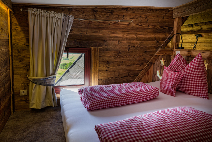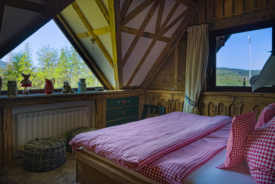• Spálňa s manželskou posteľou a bydlovým spaním atypickým vhodným pre deti